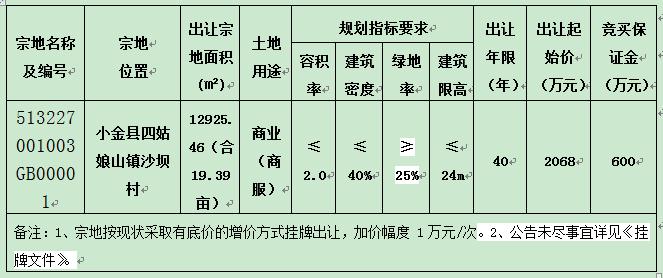 經小金縣人民政府批準,受小金縣自然資源局委托,對小金縣四姑娘山鎮沙壩村(地塊編號:513227001003GB00001)國有建設用地使用權依法進行公開掛牌出讓。現將有關事項公告如下: