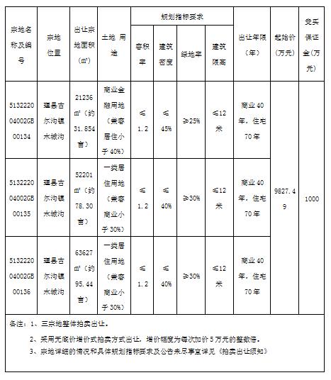 經理縣人民政府批準,受理縣自然資源局委托,定于 2021年7月8日10:00在阿壩州公共資源交易中心四樓產權交易大廳(汶川縣威州鎮東街246號),對理縣古爾溝鎮木城溝三宗地塊(宗地編號:513222004002GB00134;513222004002GB00135;513222004002GB00136)國有建設用地使用權依法進行整體公開拍賣,現將有關事項公告如下:
