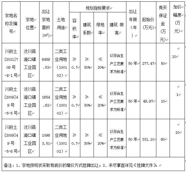 經汶川縣人民政府批準,受汶川縣自然資源局委托,對川府土[2021]709號-4-1號地塊、川府土[2009]49號-5-5號地塊、川府土[2009]49號-5-6號地塊依法進行公開掛牌出讓。現將有關事項公告如下: