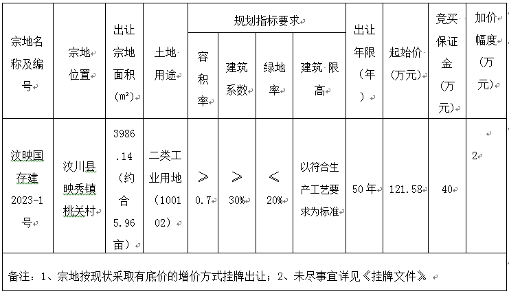 汶映國存建2023-1號地塊掛牌出讓公告