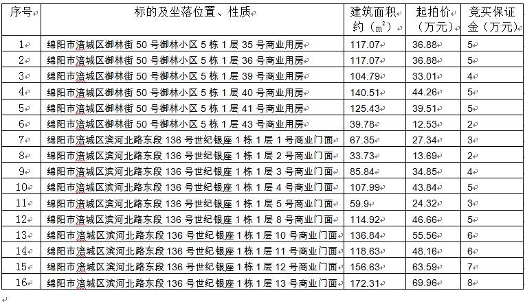 三、咨詢(xún)及報(bào)名時(shí)間:公告之日起至 2024年11月28日下午17:00止;上述競(jìng)買(mǎi)保證金以現(xiàn)金方式存入或銀行轉(zhuǎn)入我公司拍賣(mài)專(zhuān)戶(hù)(戶(hù)名:四川盈信天地拍賣(mài)有限公司 開(kāi)戶(hù)行:四川三臺(tái)農(nóng)村商業(yè)銀行股份有限公司總行營(yíng)業(yè)部 賬號(hào):2440 0120 0000 23484)。敬請(qǐng)有意競(jìng)買(mǎi)者按要求交納競(jìng)買(mǎi)保證金(以銀行到賬時(shí)間為準(zhǔn),不計(jì)利息,競(jìng)買(mǎi)保證金到帳截止時(shí)間:2024年11月28日下午17:00止)并在中拍平臺(tái)注冊(cè)賬號(hào)并通過(guò)實(shí)名認(rèn)證,完成網(wǎng)絡(luò)報(bào)名手續(xù)等。